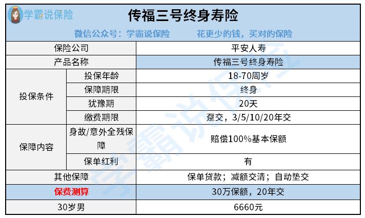 因为在传福三号这块终身寿险是100%赔偿,所以就造成它的价格偏贵,30岁男性,投保30万保额、每年缴纳6000多元的保费,总共缴纳20年,要是不考虑别的因素,一样价格能买到400~500万保额的定寿产品。