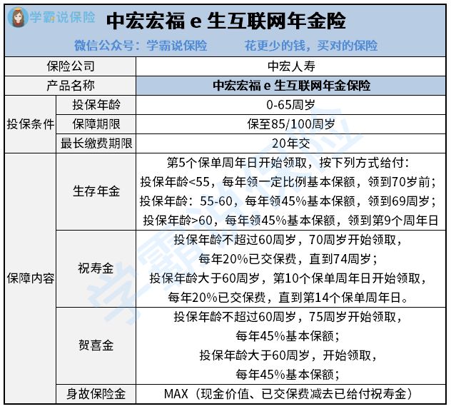 结合上图可知,我们不难看出中宏宏福e生互联网年金保险仿佛还有不少保障,具体表现如何,请看学姐给大家详细地分析分析: