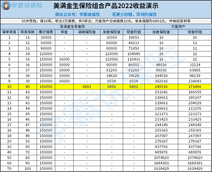 那么下面学姐假设30岁李先生投保人保寿险美满金生保险产品组合2022,购买保障期限是十年的产品,选择5年的缴费期限,保费每年交3万,基本保额为6891元,万能账户结算时采用的是中档利率。