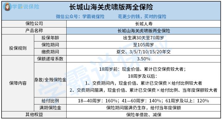 但是需要知道的是,长城山海关虎啸版两全保险规定的保额递增系数只有3.5%,也就是这款产品每年的保额和上一年一对比,增长3.5%。
