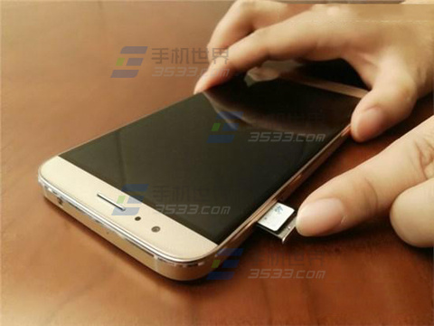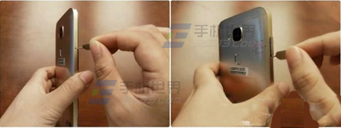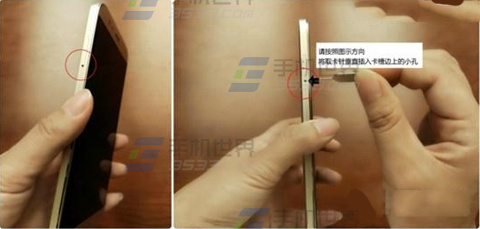 4、将手机翻转至左侧,就可以看到卡槽了。在关机状态下,使用随手机附送的取卡针取出卡托。