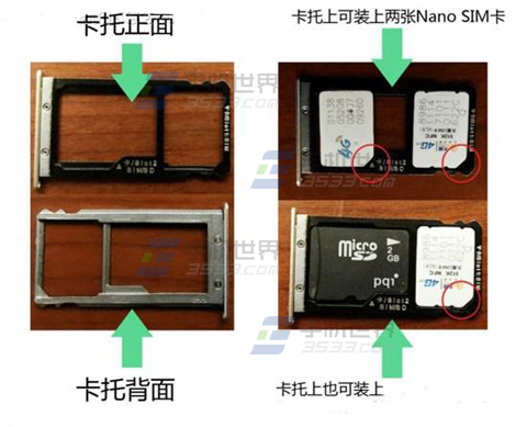 6、将卡托上装上两张Nano SIM卡,或者一张Nano SIM卡和一张Micro SD卡。(缺口的方向,请关注红圈中的卡的缺口方向,强制或者暴力安装卡可能会损坏你的卡或者卡托。)