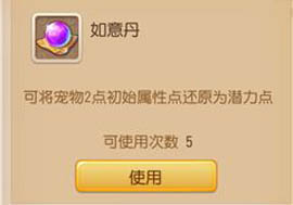 如意丹其实就是给宠物洗点的道具,能够帮助玩家挑战宠物的初始属性点。如意丹每次能够洗掉2点初始值,不过初始值≤10点时不能使用如意丹。而且经过如意丹洗掉的初始值可以变为宠物的潜力值。