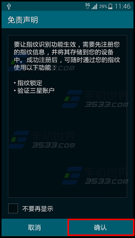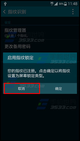 9)阅读“启用指纹锁定”提示后,这里以点击【取消】为例。