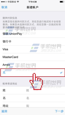 8.在付款信息中,可以选择”无“,这样就不用绑定银行卡和信用卡了