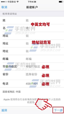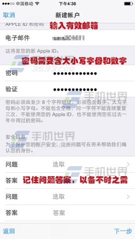 7.填写创建Apple ID需要的相关信息。请注意邮箱要**实的,因为后面需要验证;密码需包含大小写字母及数字;密保问题要记住答案,方便到时候找回密码。