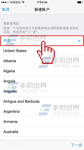 5.国家和地区一般选”中国“,然后点击”下一步“