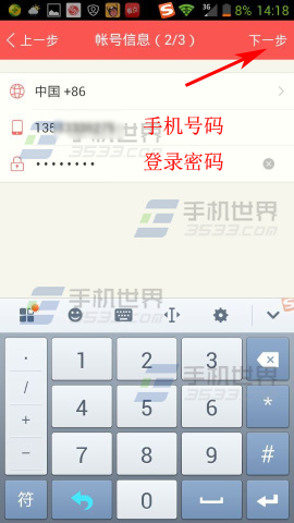 3)输入验证手机号码,以及密码,点击【下一步】;