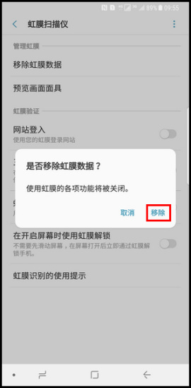 6、阅读移除虹膜数据的提示后,点击【移除】即可。
